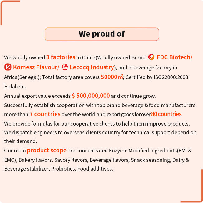 Kami menyediakan lebih dari 4000 jenis Perisa Makanan, Penstabil untuk produk susu dan jus, Probiotik, Sirup Pekat, dan produk Peningkatan Gizi.